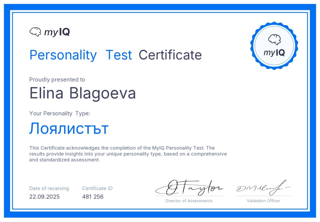 The MyIQ Personality Test highlights qualities of loyalty, responsibility, and foresight.